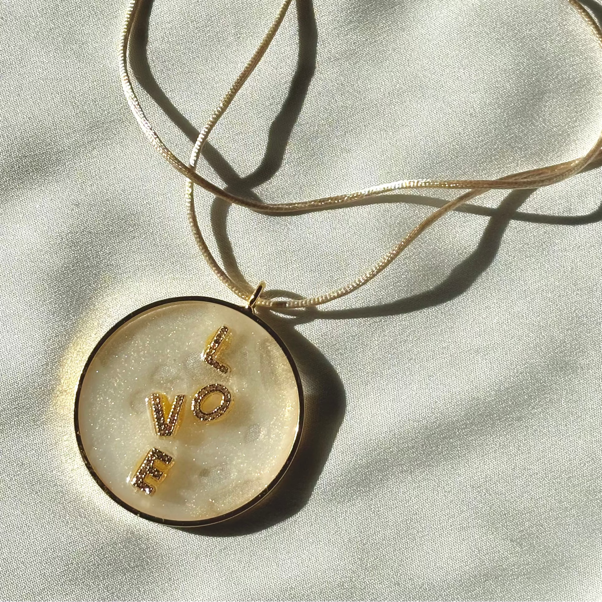 Die Buchstaben sind aus vergoldetem Messing, mit Strasssteinen versehen, eingebettet in handgefärbtem Resin.