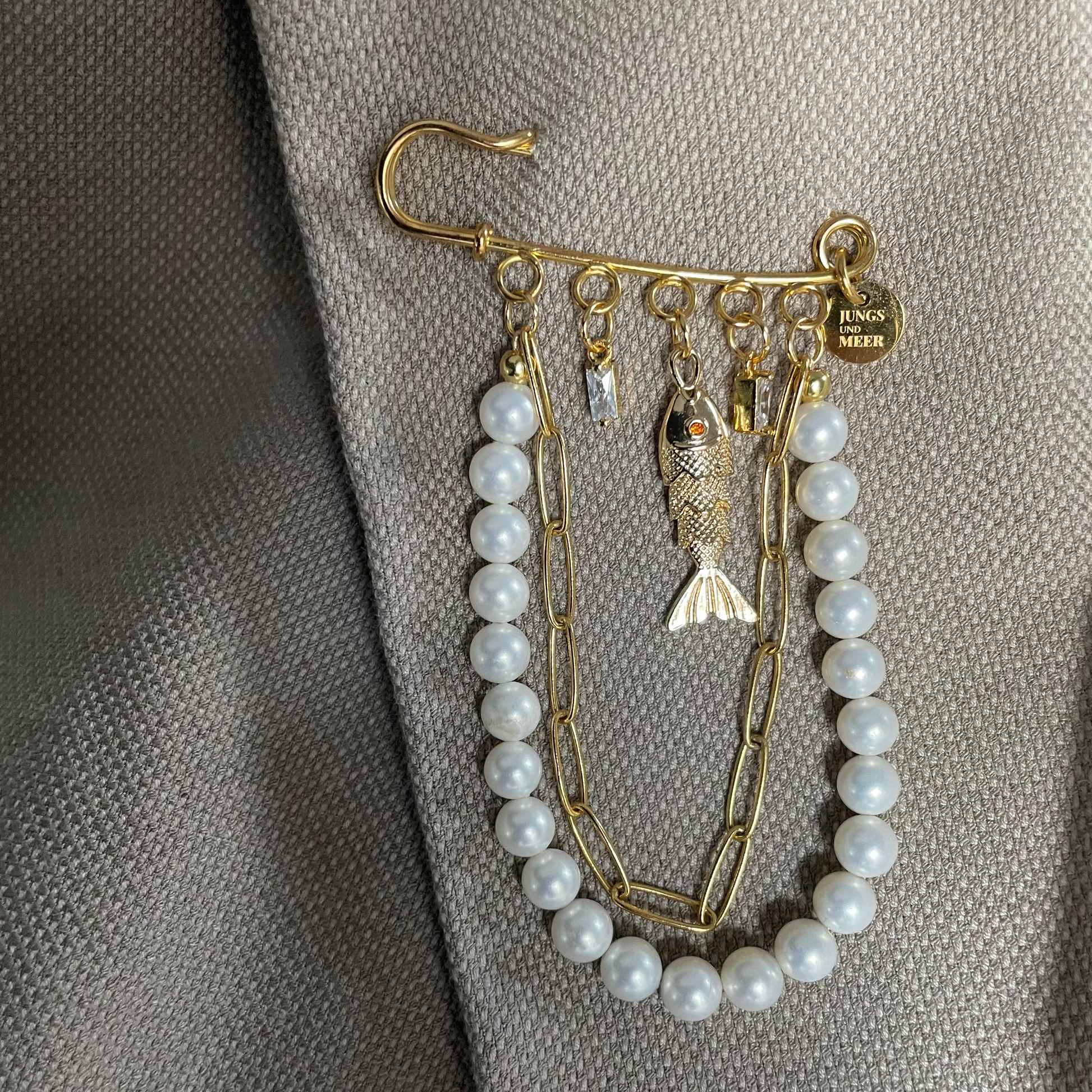 Die große goldfarbene Stecknadel dient als markante Basis und setzt ein bewusst modernes Statement. Daran hängen eine kurze Perlenkette, eine filigrane vergoldete Kette, kleine Charms und ein schlanker Fischanhänger – Details, die den Marine-Look auf subtile, stilvolle Weise aufgreifen. Straßsteine sorgen für ein leichtes Funkeln und verleihen dem IT-Piece eine exklusive Note.