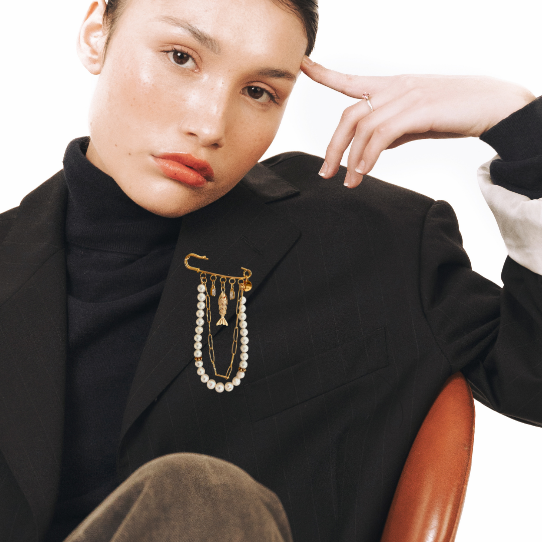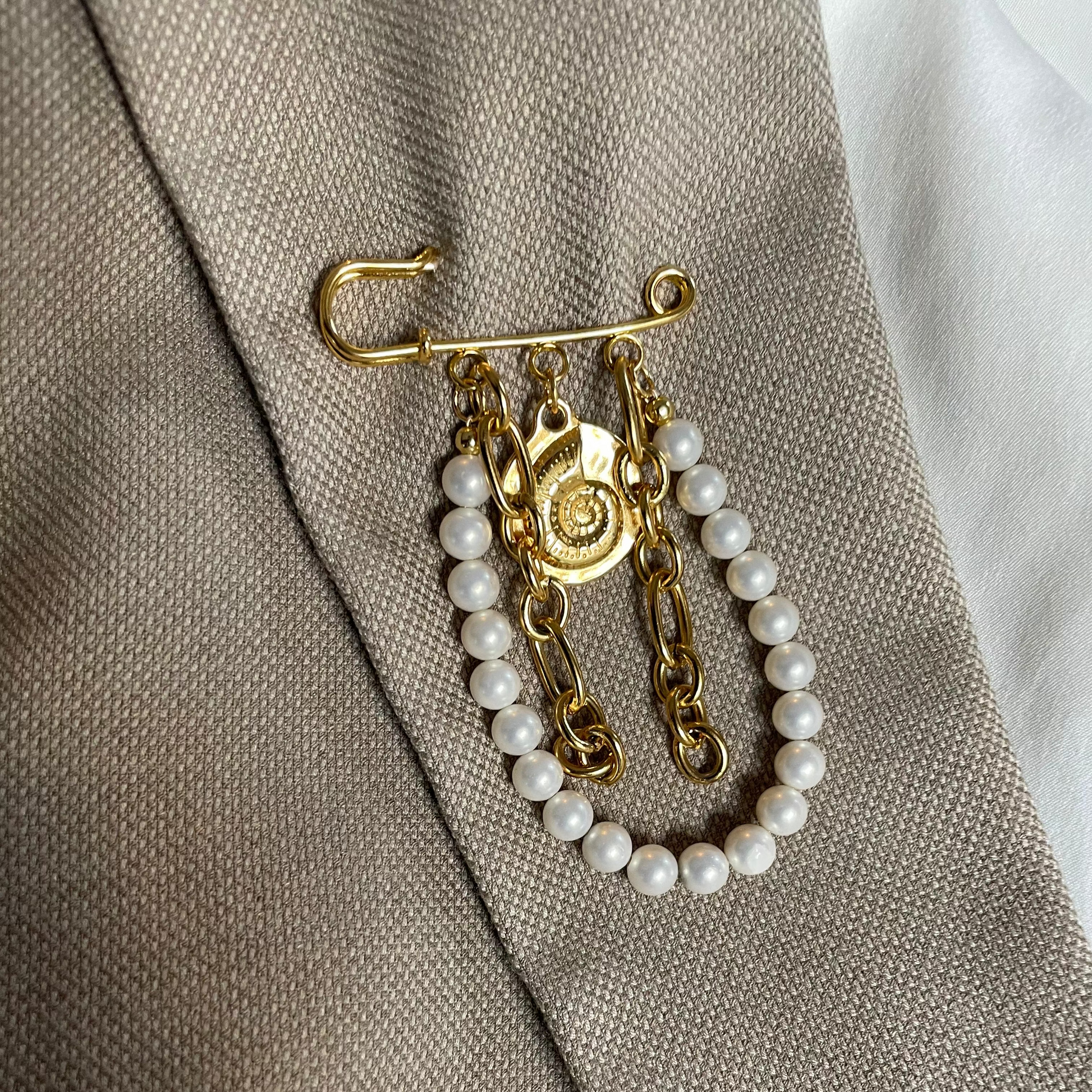 Die große goldfarbene Stecknadel dient als markante Basis und setzt ein bewusst modernes Statement. Daran hängen eine kurze Perlenkette, eine Elemente unserer Bubble Kette, und ein präsenter Muschel-Charm. Diese Kombination verleiht unserem It-Piece einen markanten und mutigen Look.